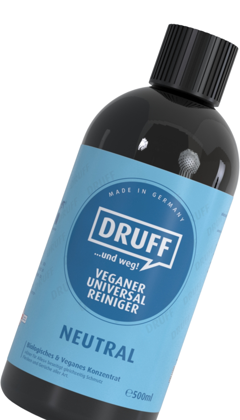 "Einer für alles" – WC-Reiniger, Glasreiniger, Fettentferner, etc. – mit dem DRUFF-Reiniger erhältst du all dies in einem hochwirksamen Produkt. Warum also noch für jeden Bereich ein separates Putzmittel verwenden, wenn du unseren vielseitigen DRUFF-Universalreiniger nutzen kannst? Unser Reiniger befreit alle Flächen, Textilien und Böden von Schmutz und unangenehmen Gerüchen.
